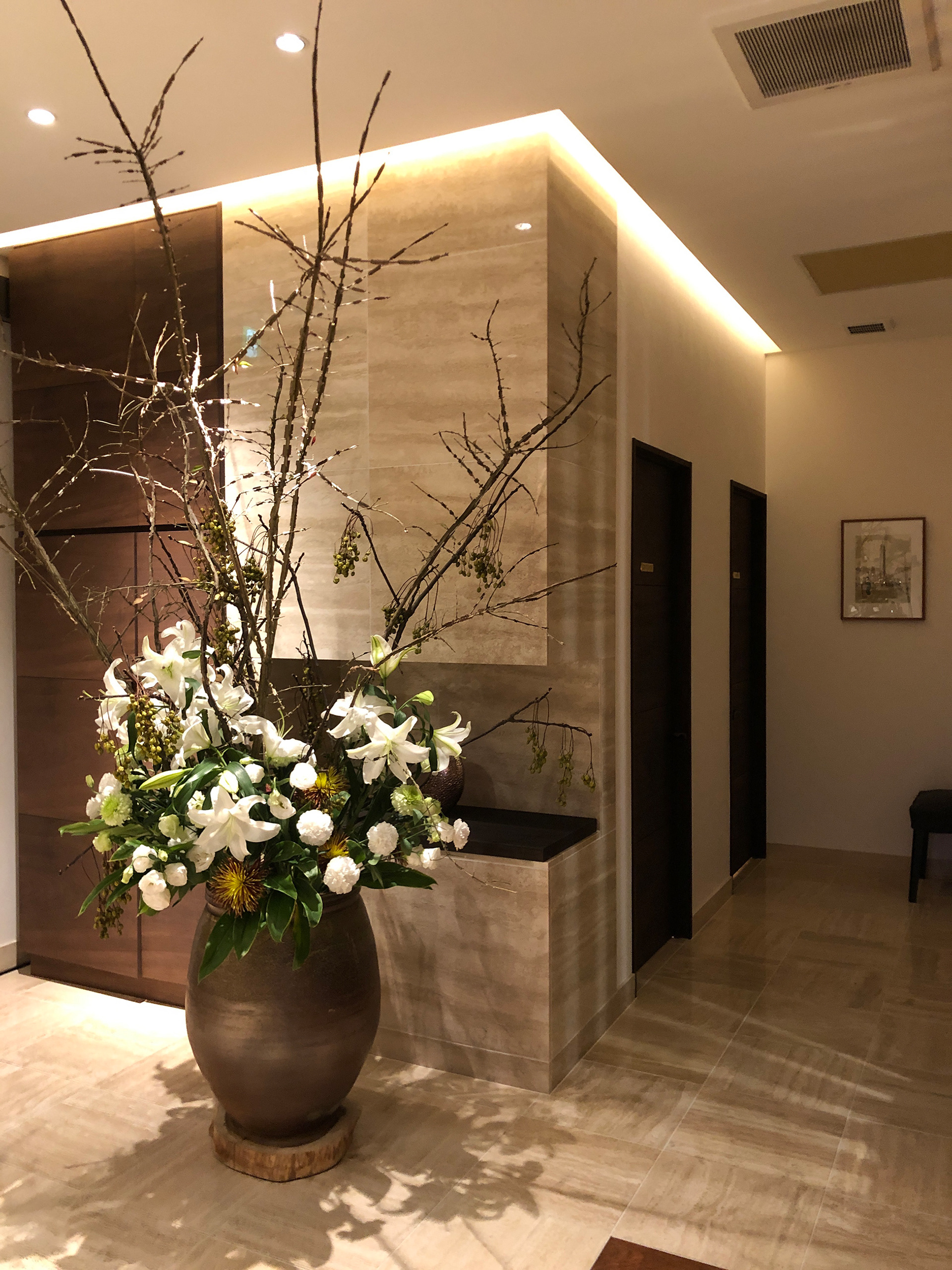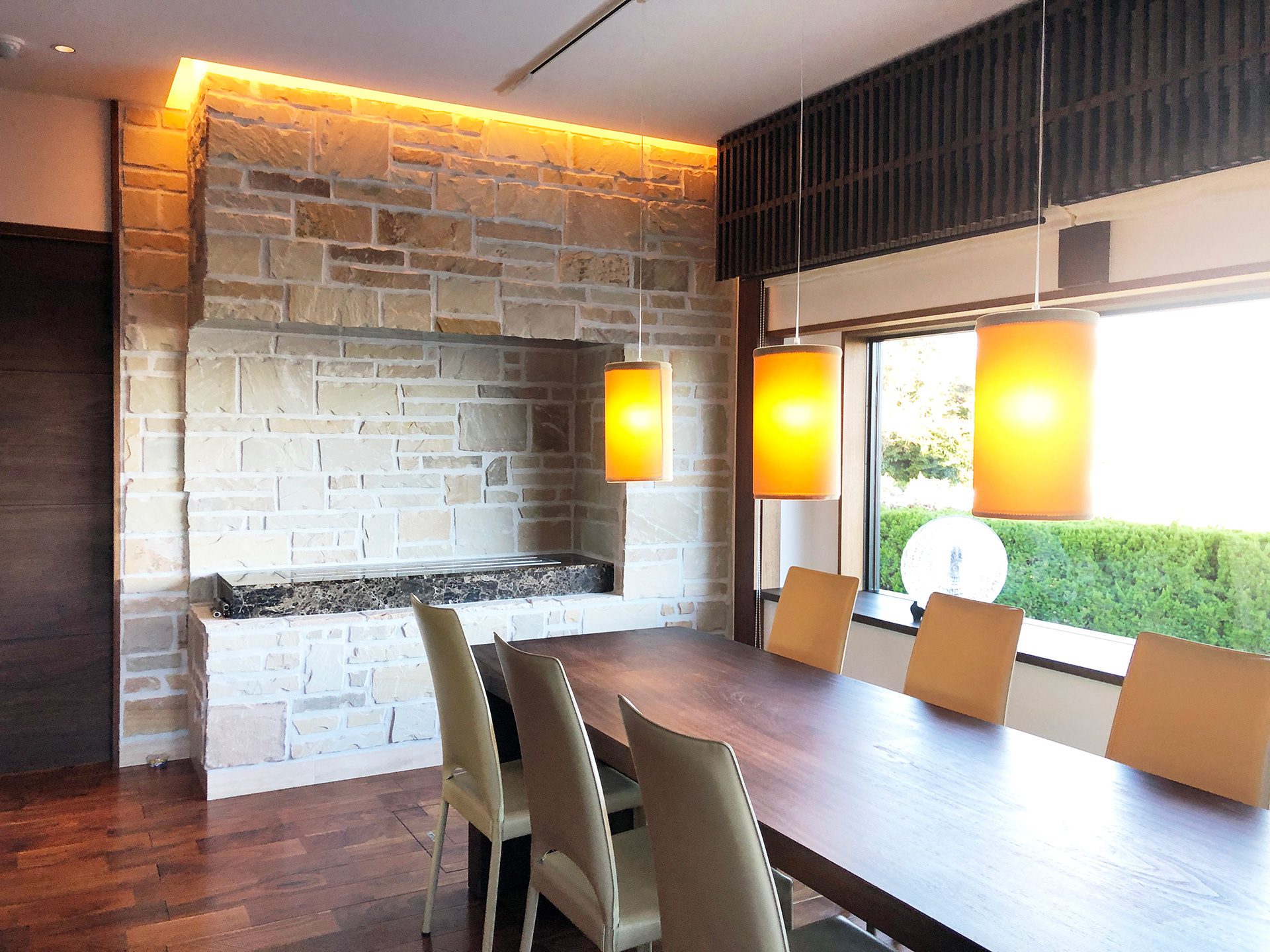 東京の店舗で使用しているトラバーチン(大理石)の壁や床、イタリアンスタッコの左官壁に加え、