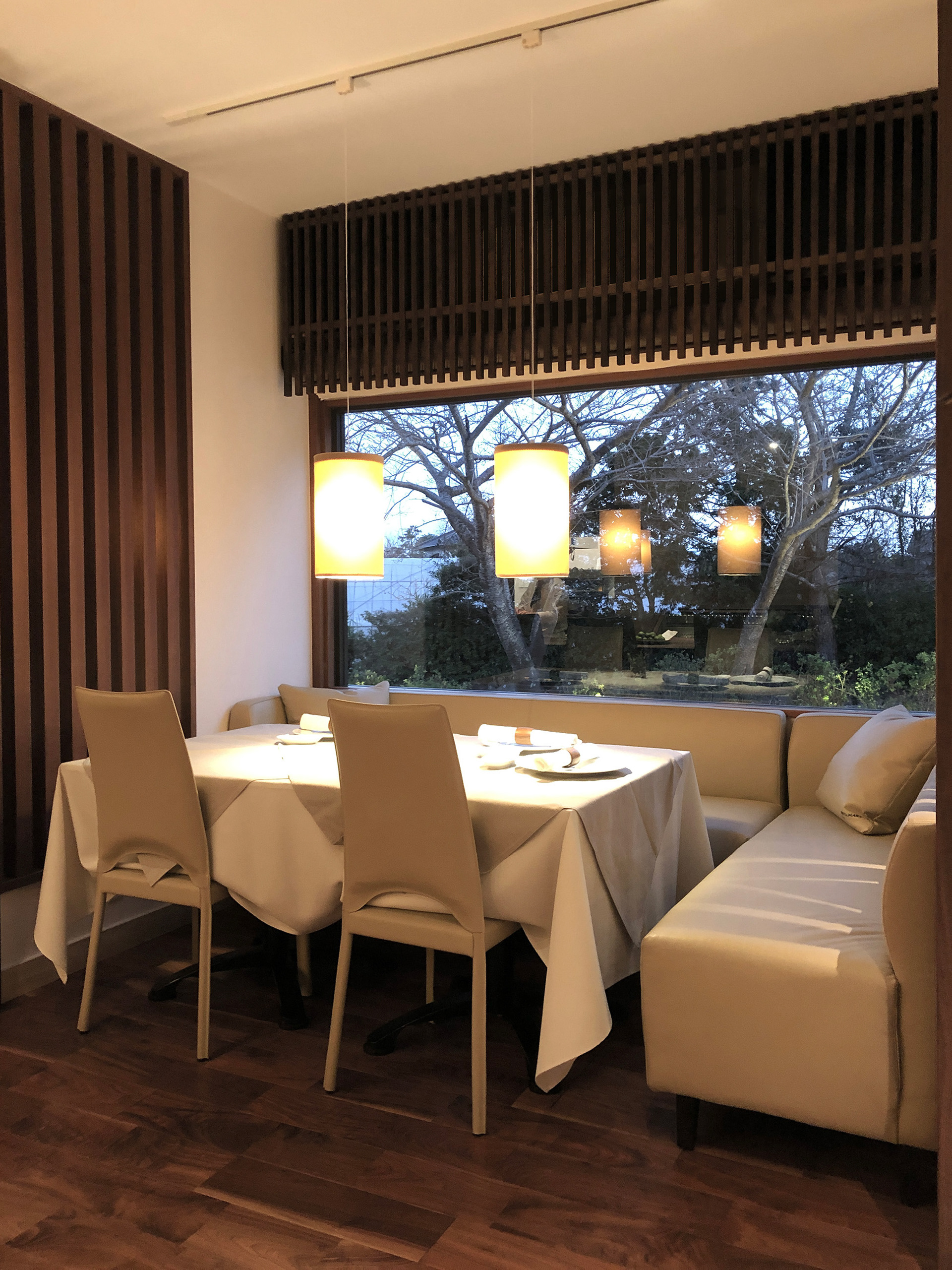 料理のコンセプトである「ネオ・ジャポネーゼ」にならい、もともと存在する柱や梁をデザインに取り入れ、