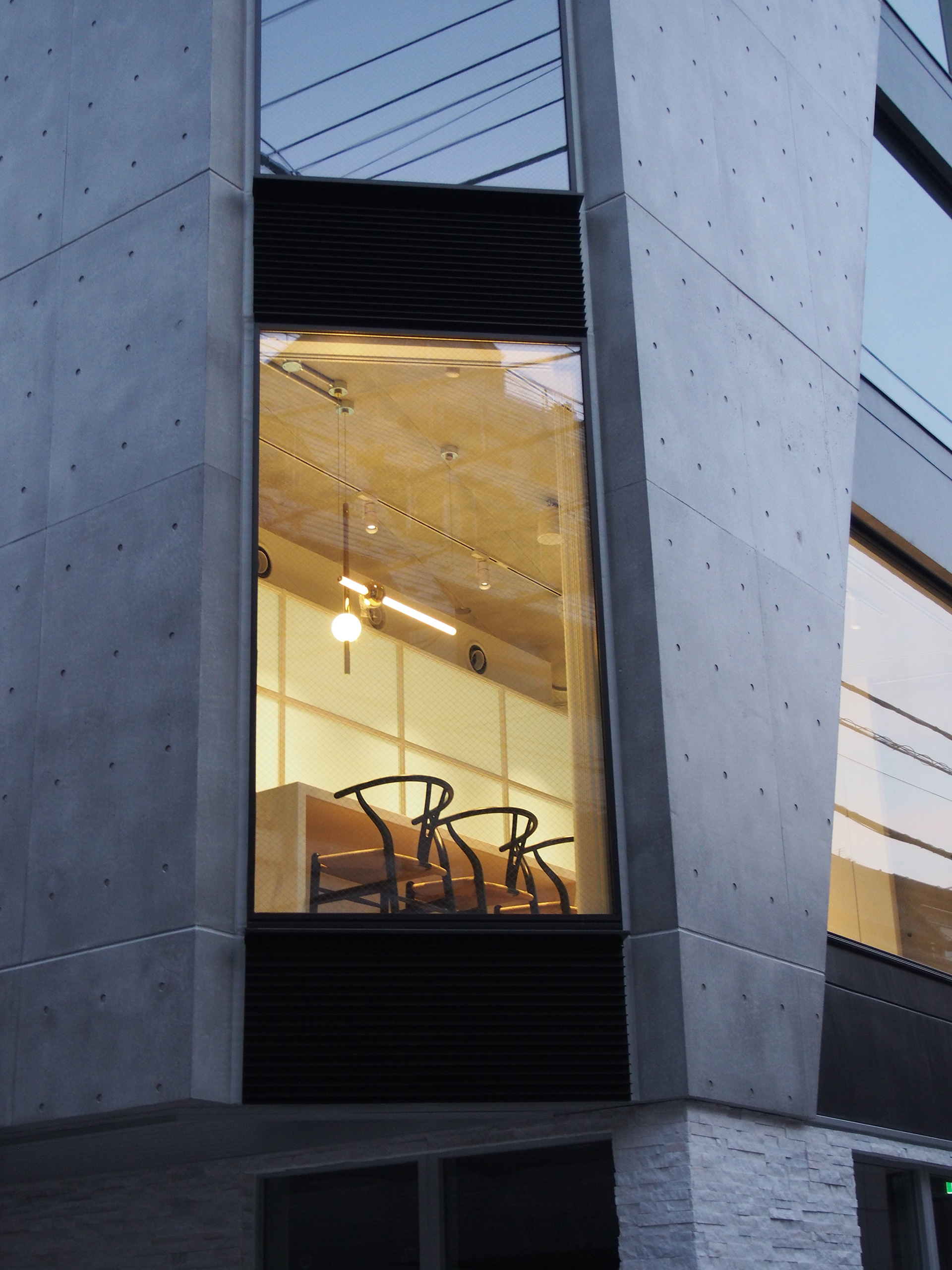 ガラスウォールの中と外で照明の色温度を変える事により、巨大なライティングボックスとなり、印象的な空間とした。